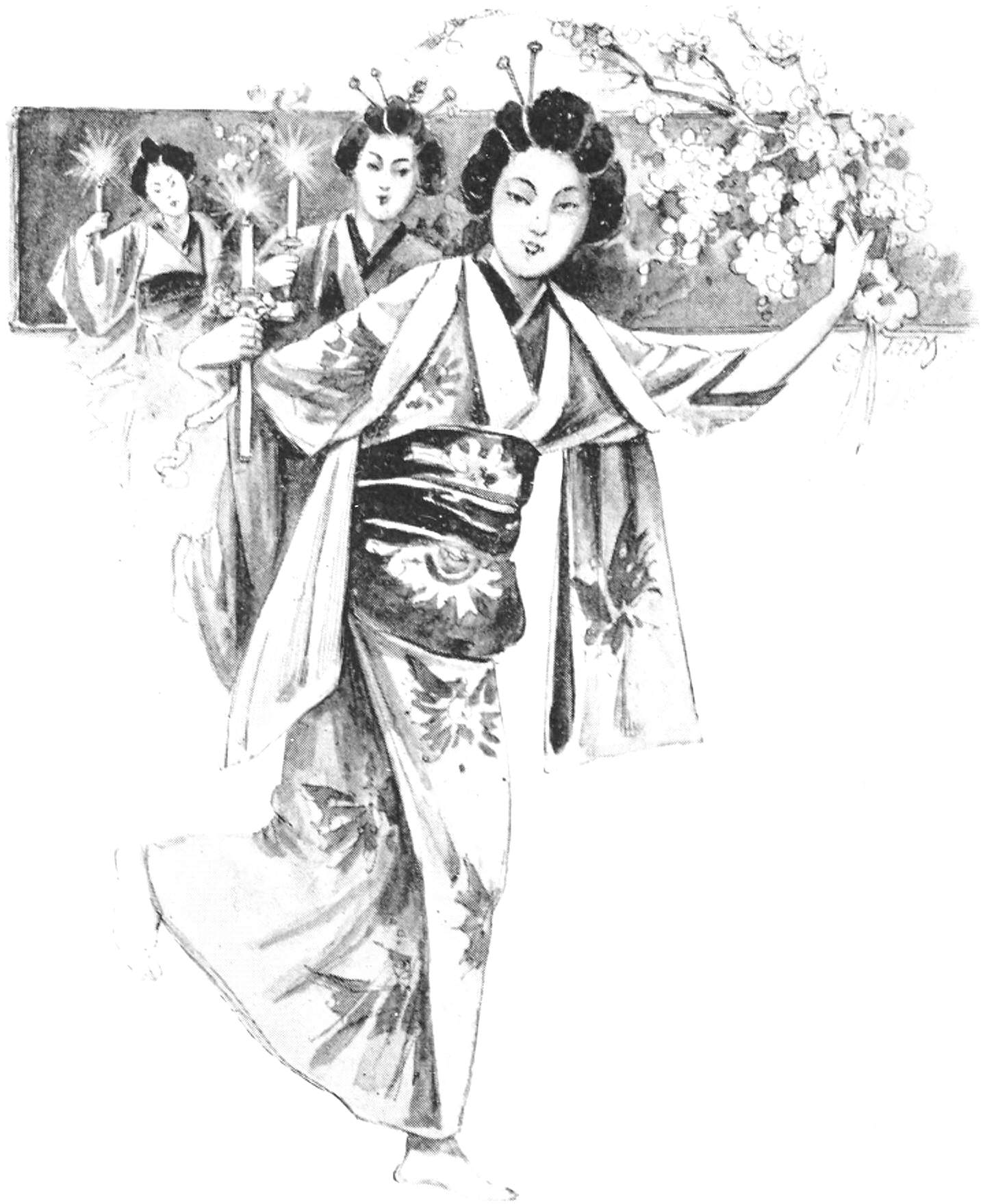 But there were other surprises in store for us. As we sat admiring these delicate creations, the doors at the rear suddenly opened, and a living wave of colour came fluttering in. At first we could distinguish nothing but a flock of miniature bats, storks, and other creatures which figure exclusively in Japanese natural history, disporting themselves among dainty representations of purple violets, dandelions, and white and pink cherry-blossoms. After recovering from our first surprise we saw that these were small pieces of embroidery on a background of pale greys and shaded blues, and then we caught sight of waving loops of hair in which were intertwined sprays of flowers and fancy pins. This delicate yet somewhat confused mass drew nearer, and we saw94 five little faces painted entirely white with the exception of clearly-defined spots of red under the eyes and lips, that were made particularly small by a skilful handling of the brush. We could but ejaculate one word: “Geisha!” These were the famous dancing girls of Japan, who lead, I fear, not too happy lives in furnishing much of the enjoyment of Japanese social life. It is only ordinary people who frequent the theatre in this country, and it falls upon these little creatures to furnish the higher classes a large part of their amusement. They dance, they sing, they joke, act as waiters, and are generally expected to supply the element of gaiety without which no dinner can be thought complete.