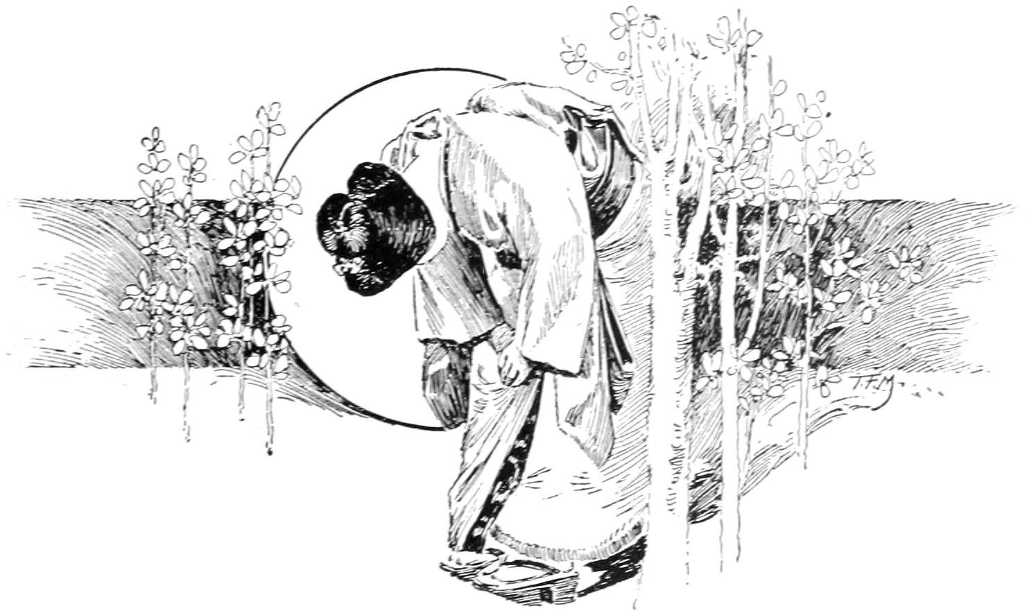 On one occasion he was delightfully æsthetic. We had been riding in a suburban district, and the roads were lined with wild-flowers. We paused a moment for a little rest, and lounged around in the grass in various attitudes of ease. I grieve to record that Cho leaned his head against a tree and went to sleep, but I have a better tale to tell of Eba. I could see him wandering around at a short distance, picking now and then a flower, which he arranged with the utmost care. He seemed to bestow a large amount of thought on every fresh addition, rejecting many a posy that he had selected, and starting on a new search for something he had not yet found. Finally satisfied, he returned and presented me with the result. It was a little bouquet not as large as your256 thumb, but perfect in every detail. It was surrounded by a thin border of green, and the flowers were the tiniest I had yet seen in this land of tiny things. The production was a real work of art, and could never have been accomplished but by a man of inherent delicacy. It seemed almost a sacrilege after this that my tasteful friend should be subjected to the indignity of lifting the ’rikisha shafts, and toiling up the steep hills like an ordinary soul.