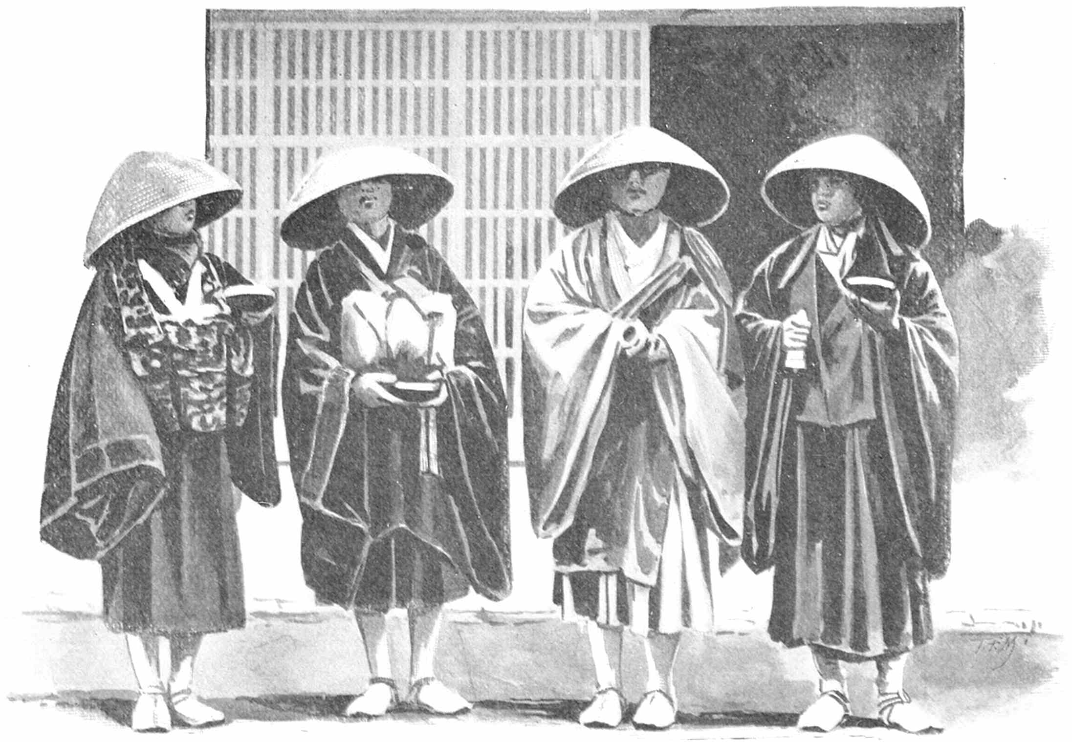 A soft, grey light came streaming through the paper panes, and in my drowsy ears I heard the chatter of the musmees, telling us that it was morning, and time to be on our way. The storm was not entirely over, though it was indulging in a momentary pause. The water was dripping from the trees, only waiting for the sunlight to pierce through the heavy clouds to clothe every leaf with sparkling gems. The sky had an air of indefiniteness and unconcern, in doubt whether to repeat its performance of the day before, or to burst forth into that splendour with which we were more familiar. There was nothing 187lacking but this for a perfect day; the wind had worn itself out during the night, the atmosphere was assuming a more oriental gentleness, the flowers were fresh and bright, and our hearts were full of gay anticipation. We had little time during the day and evening previous to think of one great predominant fact: that we were at the far-famed city of Southern Japan, warm with tradition and beauty, its history alive with the early tales of a struggling people, its temples and shrines aglow with much that is finest in human sentiment.