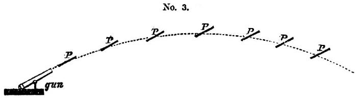 The very same causes which make the fire of a rifle accurate, tend also to make it inaccurate, paradoxical as it may seem; but this inaccuracy being to a certain extent regular and known beforehand, is not of so much consequence, though it is a decided disadvantage. It may—not to be too mathematical—be explained thus:—The axis of rotation having, as we said, a tendency always to remain parallel to its original direction, when a rifle bullet or picket (the long projectile we have described) is fired at a high angle of elevation—that is, slanting upwards into the air, in order that before it fells it may reach a distant object,—it is evident from the diagram, that if the direction of the axis of rotation remains, as shown by the lines p p p, which represent the shot at different portions of the range parallel to the original direction in the gun, the bullet or picket will not always remain with its point only presented in the direction in which it is moving, but one side of the bullet will be partially opposed to the resistance of the air. The air on that side (in front) will be denser than behind, and the disturbing or deflecting influences before described will come into operation, the two opposite tendencies described in the text and the note to a certain extent counteracting one another. While at the same time the resistance of the air has a tendency to turn the bullet from the sideways position in which it is moving with respect to the line of flight (and the effect of this is the greater the less spin the bullet has to constrain it to keep its original direction), the result of which force, conspiring with the force described in the note, is to give it a slight angular rotation round another axis, and deflect the bullet by constantly changing its general direction (this second axis of rotation) to the side to which the rifling turns. This was exemplified in the late practice with Mr. Whitworth’s gun. When firing at the very long range of 9,000 yards the 3-pounder threw constantly to the right from 32 to 89 yards.