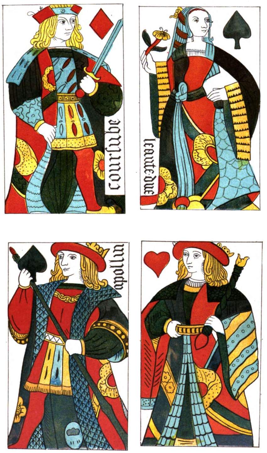 The names of the Kings of this pack—Corsube, Apollon, etc.—have already been dwelt upon, and their probable origin traced. They are minutely described by Mr. Taylor in his “History of Cards,” who says: “The figures are engraved on wood, printed with a pale ink of a brownish tint, and afterwards coloured with stencil in the usual manner. The crowns of the kings are formed of fleurs-de-lis, and the costumes are those of the period of Charles the Seventh.”
