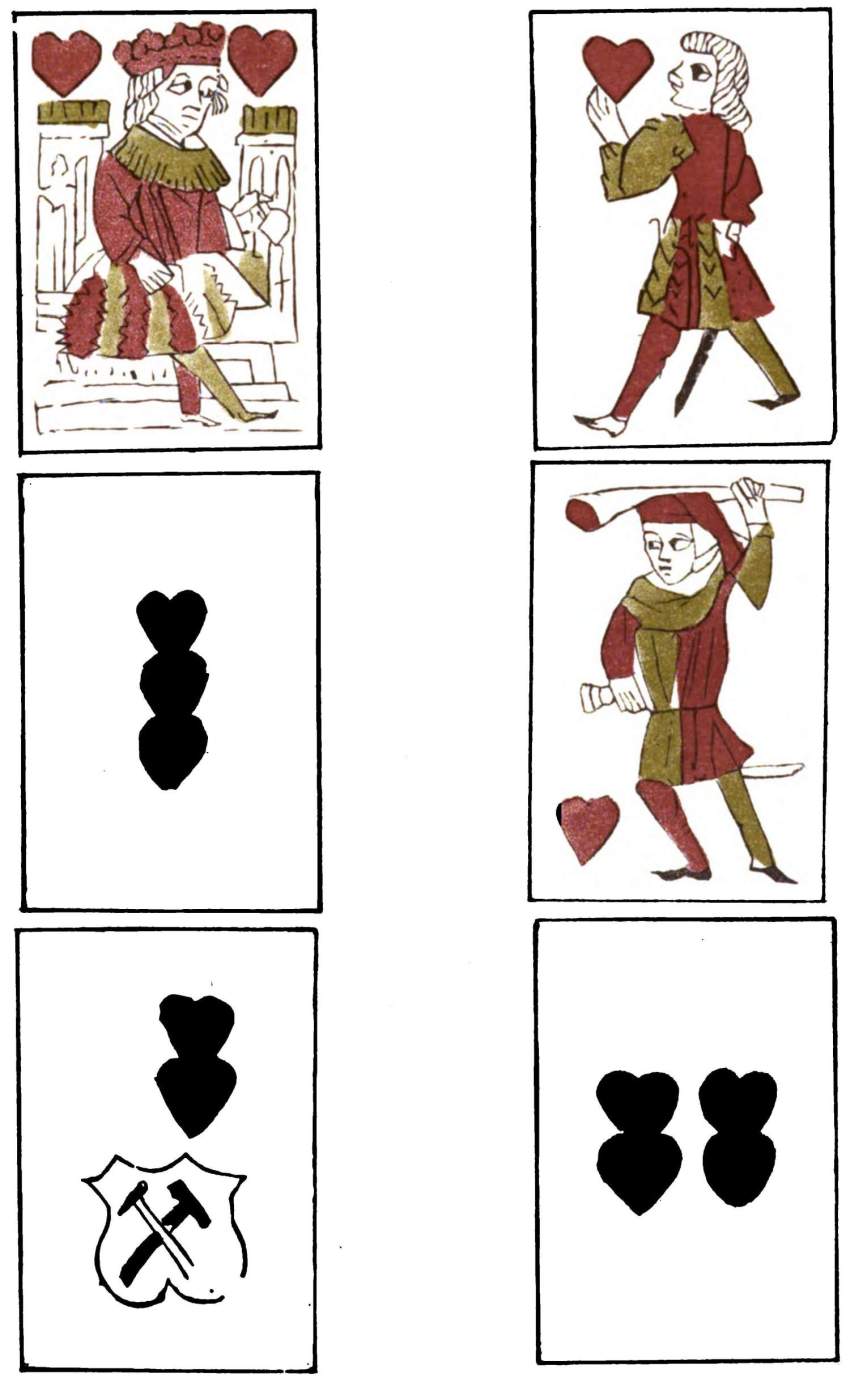 These cards were discovered in Lyons by a[Pg 148] M. Henin, who found them pasted in the cover of a book of the fifteenth century, of which they formed part of the binding. Their fortunate discoverer well understood the value of this prize, and they were carefully removed, and are now treasured as the first specimens of cards which were divided into suits with the symbols which they now bear. The book-binder’s knife has shaved off the title of the King of Hearts, or rather his name; otherwise the principal court cards are almost uninjured, and are preserved with the respect they deserve to have as the oldest surviving monarchs of the world,—their age being nearly five hundred years, the date of their invention being about 1425.