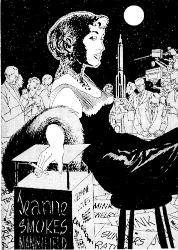 "Of course you get it! Jeanne Peterson reads Cosmopolite to while away her lonely hours. Jeanne smokes Dromedaries, relaxes in her bathtub with Luroscent, dreams of her lover on the moon on a Softafoam pillow, writes him letters and saves them for his return by using Perma-blue ink, wears a Furform coat to keep her warm while gazing at the crescent moon on chill autumn nights. Get it, honey? Get it?"