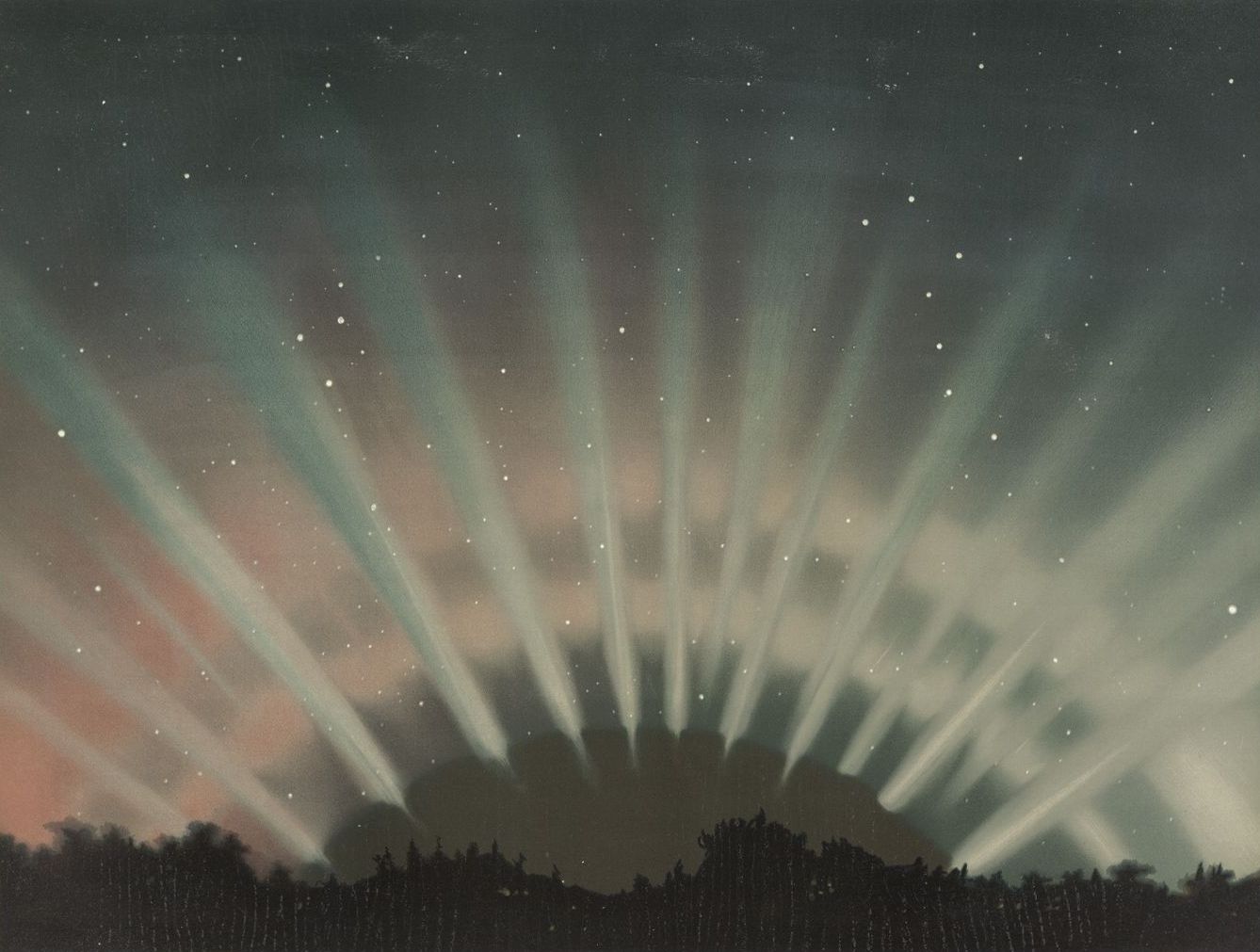 The view presents the rare spectacle of an aurora spanning the sky from east to west in concentric arches. The Polar Star is nearly central in the background, the constellation of the Great Bear on the right and Cassiopeia's chair on the left. The large star at some distance above the horizon on the right is Arcturus. The almost black inner segment of the aurora resting upon the horizon, has its summit in the magnetic meridian, which was in this case a little west of north, its arc being indented by the bases of the ascending streamers. Both streamers and arches were, when observed, tremulous with upward pulsations and there was also a wave-like movement of the streamers from west to east. The prevailing color of this aurora is a pale whitish green and the complementary red appears especially at the west end of the auroral arch. The summits of the streamers are from four hundred to live hundred miles above the earth and the aurora is therefore a phenomenon of the terrestrial atmosphere rather than of astronomical observation proper.