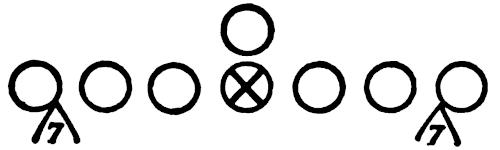 With the interior linemen from tackle to tackle, we place defensive men head on the center and tackles, as illustrated in Figure 139. A coach will stand behind the defensive men, facing the offensive men, and give hand signals indicating starting count and blocking patterns. The defensive men must react and pursue the football properly.