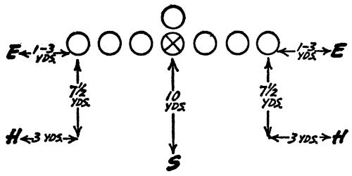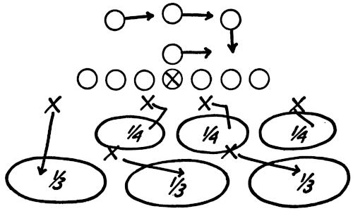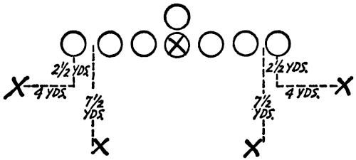 We set up a skeleton offensive unit of ends, center and a complete backfield versus the defensive ends and secondary, as illustrated in Figure 126. The offense works full speed running its outside plays and passes, and the defense is drilled in stopping the wide attack.