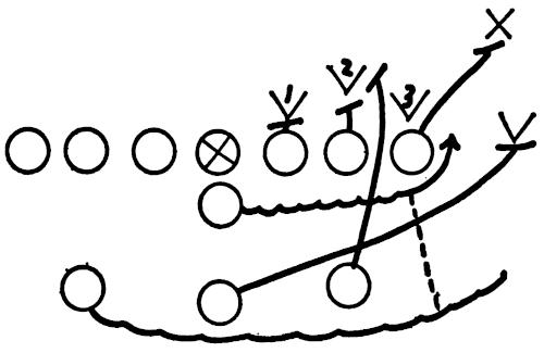 Figure 129 illustrates a good drill to teach reaction and to protect his area, which we use for our defensive ends. The end[221] assumes his normal defensive position. The first backfield blocker attempts to block the end, then the second, and finally the third blocker. As soon as the first man leaves, the second starts, and then the third blocker leaves, giving the defensive end experience in playing one blocker at a time but in rapid succession.