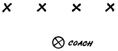 Four men line up facing a coach, in a good football position, feet moving as illustrated in Figure 140. The coach points to his right and the players using a cross-over step must react in that direction. He then points in another direction and the players stop, plant and start in this direction as quickly as possible. The drill is not only a good conditioner, but teaches quickness, too.