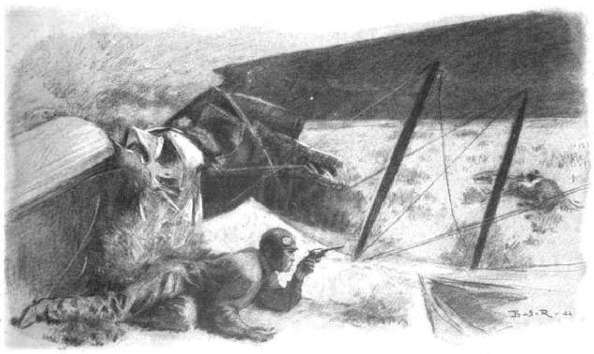 He peered toward the place where the shot had apparently come from, shielded from sight by the wreckage. Fifty yards away was the carcass of the dead horse, and even as he looked a man’s head lifted itself above the body. Trowbridge snaked his way the few inches to the remains of the cock-pit, and was rewarded with a shot that drilled through the débris just beside him. He found one of his guns, jammed between two twisted longerons. As his groping hand grasped it, a searing pain in his left leg seemed to come simultaneously with the crack of another shot.