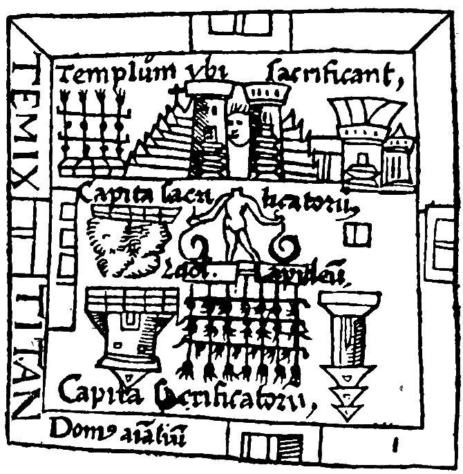 On the top, where there was a pavement and small plaza rather more than seventy feet wide, two very large altars had been built, one apart from the other, set almost at the edge or border of the tower on the east side, so that there was only just sufficient ground and space for a man to walk [on the east side] without danger of falling down from the building.