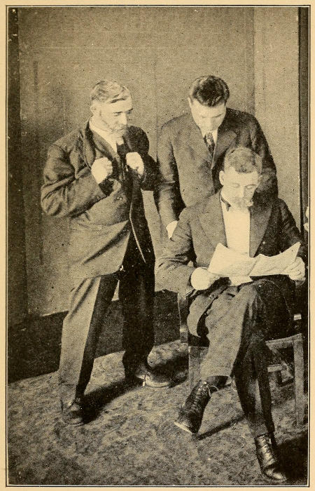 When told that they would have to paint the scenery themselves, they looked somewhat surprised. It is doubtful whether either of them had ever painted anything more than his mother’s kitchen floor or perhaps whitewashed a fence or the interior of a barn. They finally decided to do the job. A painter was called over the phone who said he wouldn’t charge the boys a cent for the colors if they painted the scene. Up in an attic of a building near by there was an old faded pink curtain that had been cast aside. It was thought to be no longer useful. Within twenty-four hours the curtain was brought over and hoisted, and the floor of the stage adjacent to the office was covered with paint pails, brushes, and water colors. With dogged determination they decided to finish the painting during the holiday vacation. A few minutes before midnight on[5] New Year’s Eve the last stroke of the brush was made. The quaint cottage, the snow white-capped mountain, the tumbling waterfall and the steep ascending cliffs were painted in a manner which brought many favorable comments from competent art critics. The blending of the colors was magnificent. It was genuine art. The beauty of it all was that these two young men found that they could express themselves even on canvas.