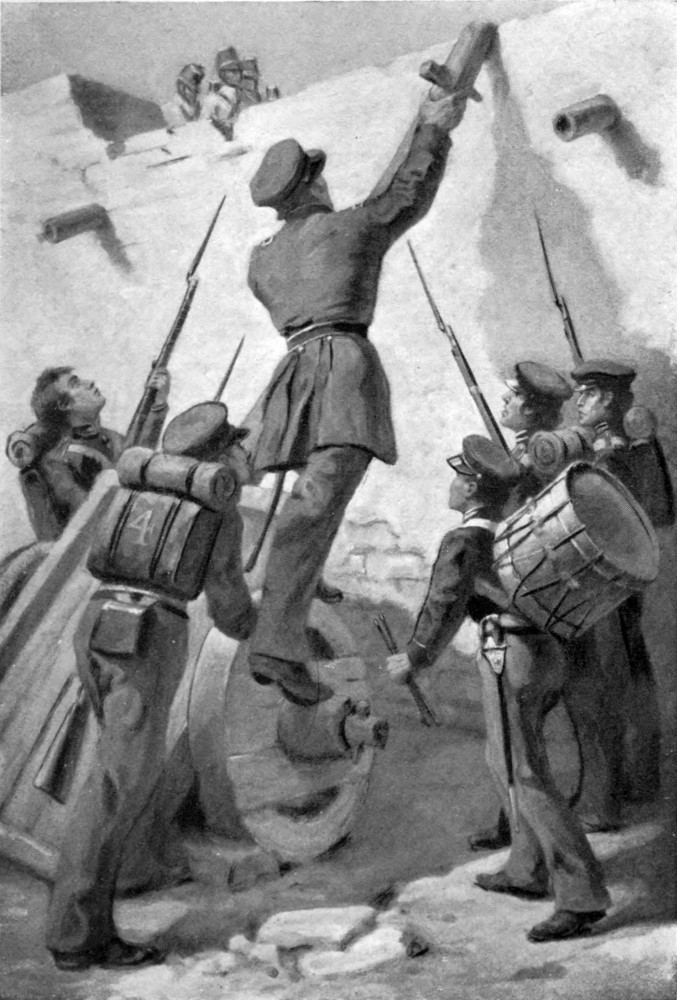 The roofs of the houses had been cleared well-nigh to the city wall. Lieutenant Hunt’s gun opened point blank upon the gateway battery. And listen! See! There was another great cheer—suddenly the roofs right against the wall on either side of the gate had upheaved, a torrent of blue caps and blue jackets spurted out like bursts of water, and broke white with a terrific fire into the gateway battery and even over the wall itself.