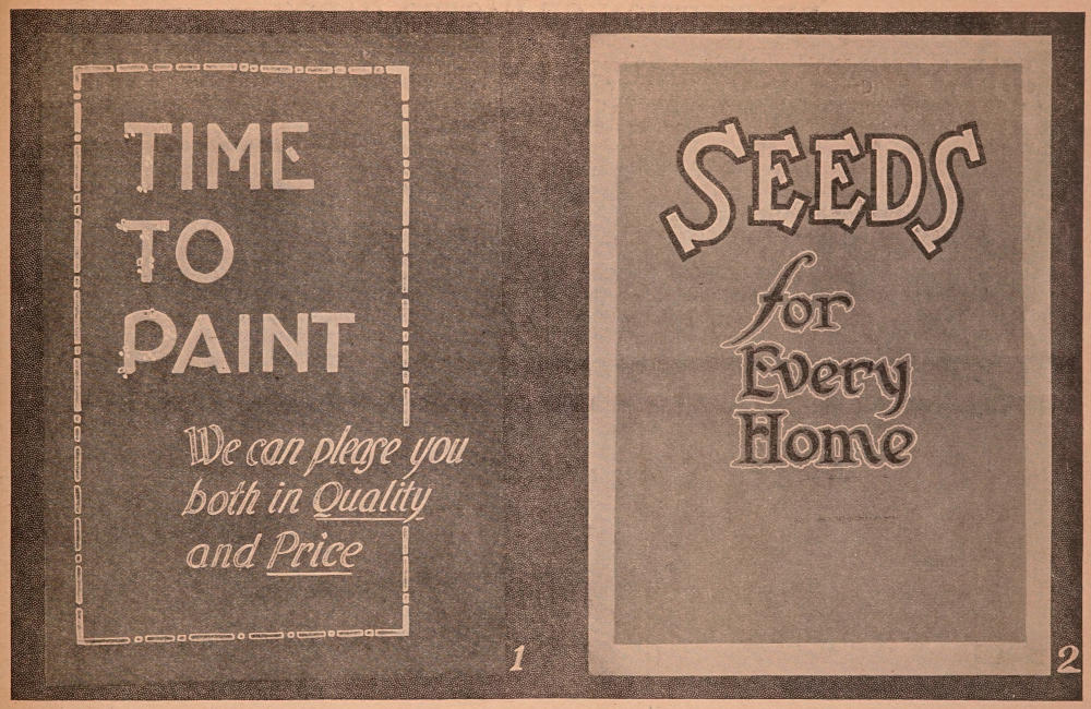 Card No. 2. Size 16×22 inches. Plain white cardboard mounted with a card of pale green. The word “Seeds” is lettered in deep yellow, closely outlined in dark green. The smaller lettering is done in the same shade of dark green and outlined “raggedly” in bright yellow. The color combinations are very effective, especially in connection with this particular kind of “merchandise.”