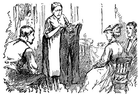 Mrs. Laura brought out various garments, in various stages of decay, each of which was examined in turn. One pair would stand it a spell for second-best; another would do for rainy weather; another, for rough work; and so on. A pair of gray satinets, weak-kneed, and in other respects decrepit, Elbridge remarked, with his one-sided twinkle, were “jest about a herrin’.” But his mother declared them to be the very things to wear in the woods. Then he picked up a pair of brown ones, saying they were too short ever to be worn again without “splicing,” and that Hannah[91] Knowles had better take them. His mother said she would see, first, if there were any pieces like them in the bag, “to lengthen the legs down.” The bundle-bag was brought forward, roll after roll taken out, and its label read: “Prince’s mixed suit o’ clothes,” “Father’s last tail-coat,” “Father’s summer alpaca waistcoat,” “Elbridge’s sack cut out by Sally Payne’s pattern,” “Prince’s satinet pantaloons,” “Elbridge’s frock-coat he had cut out by the tailor,” “Elbridge’s brown small-legs pantaloons”—