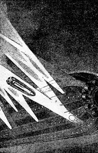 [4] Unlike the larger war vessels of the patrol, speedsters are very narrow in proportion to their length, and in their design nothing is considered save speed and maneuverability. Very definitely they are not built for comfort. Thus, although their gravity plates are set for horizontal flight, they have braking jets, under jets, side jets, and top jets, as well as driving jets; so that in inert maneuvering any direction whatever may seem "down," and that direction may change with bewildering rapidity.