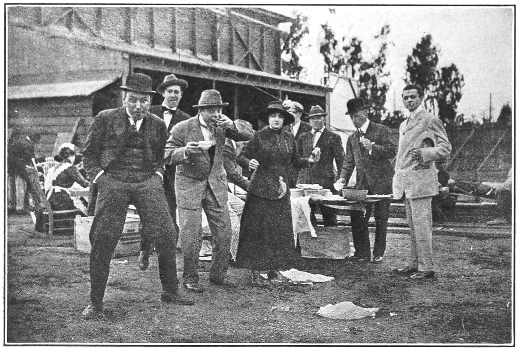 Then Miss Ring, who had now taken over one of Los Angeles’s show places, on the Fourth of July gave a party—a red, white, and blue party at which were gathered more notables than had as yet ever been brought together at a social function in Los Angeles. It was Broadway transplanted. There were David Belasco, Laura Hope Crews, Charlie Chaplin, Edna Purviance, Julian Eltinge, Geraldine Farrar, Jesse Lasky, Mr. Goldwyn, Wallace and Mrs. Reid, Mr. Morris Gest, then representative for Geraldine Farrar and Raymond Hitchcock, who viewing from the back piazza the distant lights of Los Angeles was supposed to have said something when he remarked, “This reminds one of a diamond bar pin.”