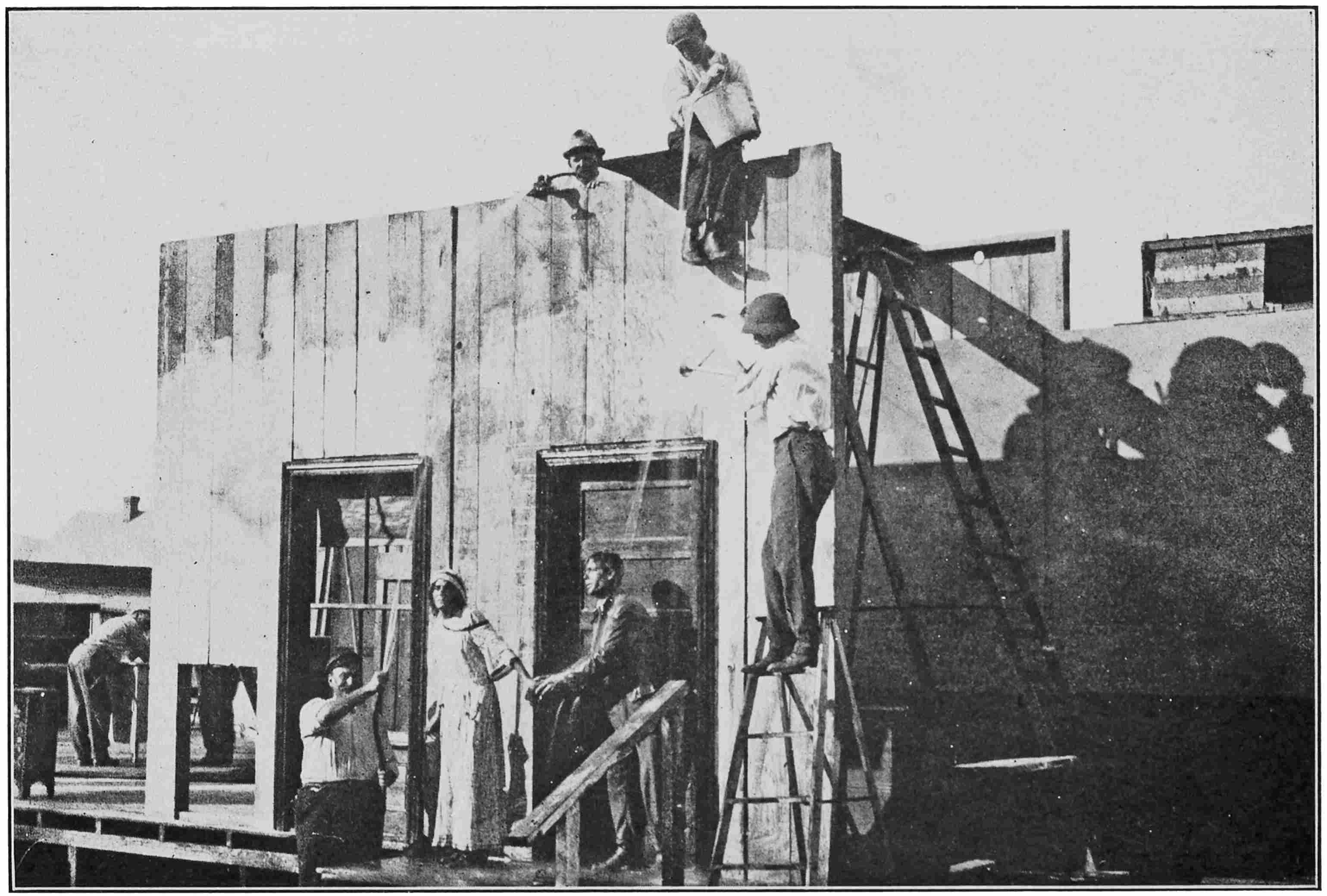 After a short time at the Mutual studio, Mr. Griffith and his company went to California. At the old Kinemacolor lot they encamped, the Mutual having taken over that studio. The carpenters got busy right away, and soon little one-story wooden buildings crowded to the sidewalk’s edge, and the place began to look like a factory. The sprinkling can that had given sustenance to red geraniums and calla lilies was needed no more.