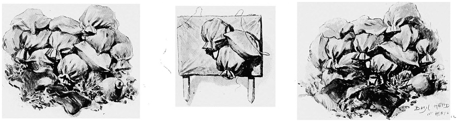 | Method of inserting Loophole. 1. Original Section of Parapet; 2. How bags are arranged and fixed round loophole to imitate original parapet (Gray’s Boards.); 3. Parapet reconstructed with loophole | 64 |