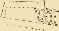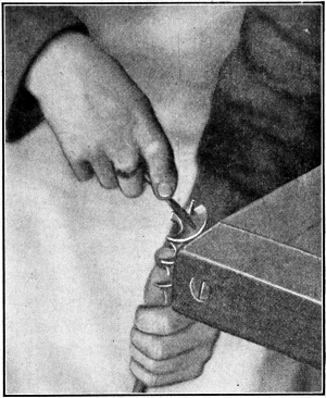 (F.) In rubbing, be sure that the corners are not rubbed through, as the pressure will naturally be more upon the corners than upon a broad surface. This may be avoided by using care that the pressure is not applied so as to bear on the corner; grasp the rubbing material in such a way that no loose edges will be beyond control, as in Fig. 99, or the finish may be badly scratched; this applies especially to the corners. The rubbing should always be in the direction parallel with the grain of the wood.