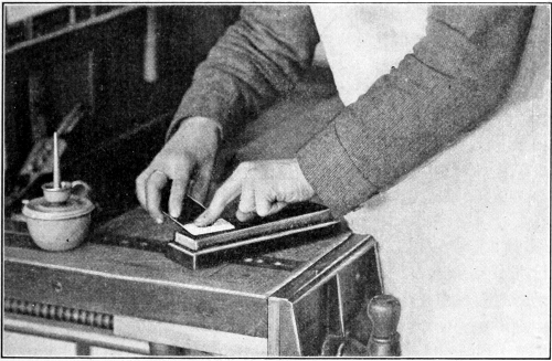 (C.) In applying shellac finish, one coat is laid upon the other, each coat being rubbed down with number 00 sandpaper, or with pulverized pumice stone before the next coat is spread. For this purpose, a sheet of sandpaper should be cut into eighths, and one of these pieces folded in the center of its long dimension, and held in the hand as shown in Fig. 99, which keeps its edges from scratching the surface. If it is desired to rub the shellac down to a surface with pumice stone, it should be applied with hair-cloth, or with harness maker’s felt, moistened with oil or water; but for ordinary work, sandpaper will give satisfaction, and as it is more convenient, it is much used.