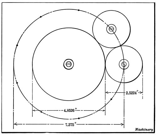 Two other jobs that illustrate this method may be of interest. The first one, shown in Fig. 11, required the locating of nine equally-spaced holes on a circumference of 7⅜ inches diameter. In any such case, the size of the smaller disks is found by multiplying the diameter of the circle upon which the centers of the disks are located by the sine of half the angle between two adjacent disks. The angle between the centers of adjacent disks equals 360 ÷ number of disks. 360 ÷ 9 = 40; hence, in this case, the diameter of the smaller disks equals 7⅜ multiplied by the sine of 20 degrees, or 7⅜ × 0.34202 = 2.5224 inches. 7⅜-2.5224 = 4.8526 inches, which is the diameter of the central disk.