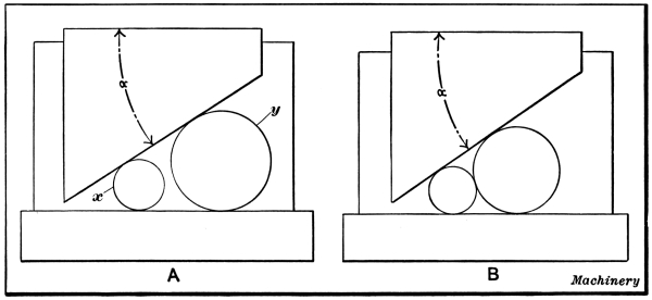 Another method of accurately locating angular work is illustrated at B in Fig. 14. In this case, two disks are also used, but they are placed in contact with each other and changes for different angles are obtained by varying the diameter of the larger disk. The smaller disk is a standard 1-inch size, such as is used for setting a 2-inch micrometer. By this method any angle up to about 40 degrees can be obtained within a very close limit of accuracy. The following rule may be used for determining the diameter of the larger disk, when both disks are in contact and the diameter of the small disk is known: [Pg 16]
