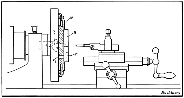 After the button is set by this method, it is removed and the plug in the spindle is replaced by a drill and then by a boring-tool or reamer for finishing the hole to size. In a similar manner the work is set for the remaining holes. The plug P for the spindle must be accurately made so that the outer end is concentric with the shank, and the latter should always be inserted in the spindle in the same relative position. With a reasonable degree of care, work can be set with considerable precision by this method, providing, of course, the buttons are properly set. [Pg 37]