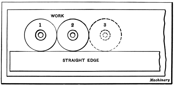 One method of checking the accuracy of the location of holes bored in the milling machine, is to insert closely fitting ground plugs into the bored holes and then determine the center-to-center distance by taking a direct measurement across the plugs with a micrometer or vernier caliper. For example, if holes were to be bored in a jig-plate, as shown in Fig. 1, assuming that hole A were finished first, the platen would then be moved two inches, as shown by the feed dial; hole B would then be bored slightly under size. Plugs should then be accurately fitted to these holes, having projecting ends, preferably of the same size. By measuring from one of these plugs to the other with a vernier or micrometer caliper, the center distance between them can be accurately determined, allowance being made, of course, for the radii of each plug. If this distance is incorrect, the work can be adjusted before finishing B to size, by using the feed-screw dial. After hole B is finished, the knee could be dropped 1.5 inch, as shown by the vertical feed dial, and hole C bored slightly under size; then by the use of plugs, as before, the location of this hole could be tested by measuring center distances between C-B and C-A.