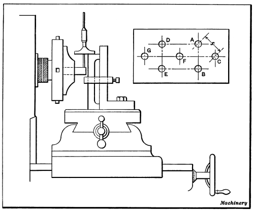 After the piece in the chuck is trued, the table and knee are adjusted until the center of the spindle is in alignment with the center of the first hole to be machined. This setting of the jig-plate is effected by measuring with a micrometer depth gage from the top and sides of the work, to the turned plug, as illustrated in Fig. 26. When taking these measurements, the radius of the plug in the chuck is, of course, deducted. When the plate is set the plug is removed from the chuck and the first hole drilled and bored or reamed to its proper size. We shall assume that the holes are to be located as shown by the detail view, Fig. 26, and that hole A is the first one bored. The plug is then again inserted in the chuck and trued with the tool, after which [Pg 35] it is set opposite the place where the second hole B is to be bored; this is done by inserting an accurately fitting plug in hole A and measuring from this plug to the turned piece in the chuck, with an outside micrometer as indicated in Fig. 27. Allowance is, of course, again made for the radii of the two plugs. The horizontal measurement can be taken from the side of the work with a depth gage as before. The plug is then removed and the hole drilled and bored to the proper size. The plug is again inserted in the chuck and turned true; the table is then moved vertically to a position midway between A and B, and then horizontally to the proper position for hole C, as indicated by the depth gage from the side of the work. The location can be verified by measuring the center distances x with the micrometer. In a similar manner holes D, E, F and G are accurately located.