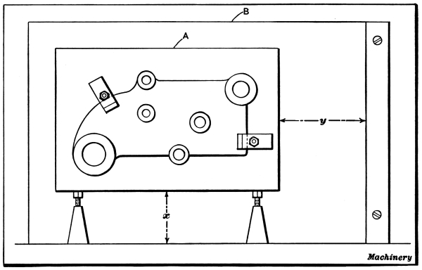 It is frequently necessary to bore holes in cast jig-plates or machine parts, which either have irregularly shaped or unfinished edges. A good method of locating such work is illustrated in Fig. 30. The part to be bored is attached to an auxiliary plate A which should have parallel sides and at least two edges which are straight and at right angles to each other. This auxiliary plate with the work, is clamped against an accurate angle-plate B, which should be set square with the axis of the machine spindle. A parallel strip is bolted to the angle-plate and the inner edge is set square with the machine table. After the first hole is bored, the work is located for boring the other [Pg 38] to the edge of the auxiliary plate, and horizontal measurements y between the parallel and the plate. These measurements, if quite large, might be taken with micrometer gages, whereas, for comparatively small adjustments, size blocks might be more convenient.