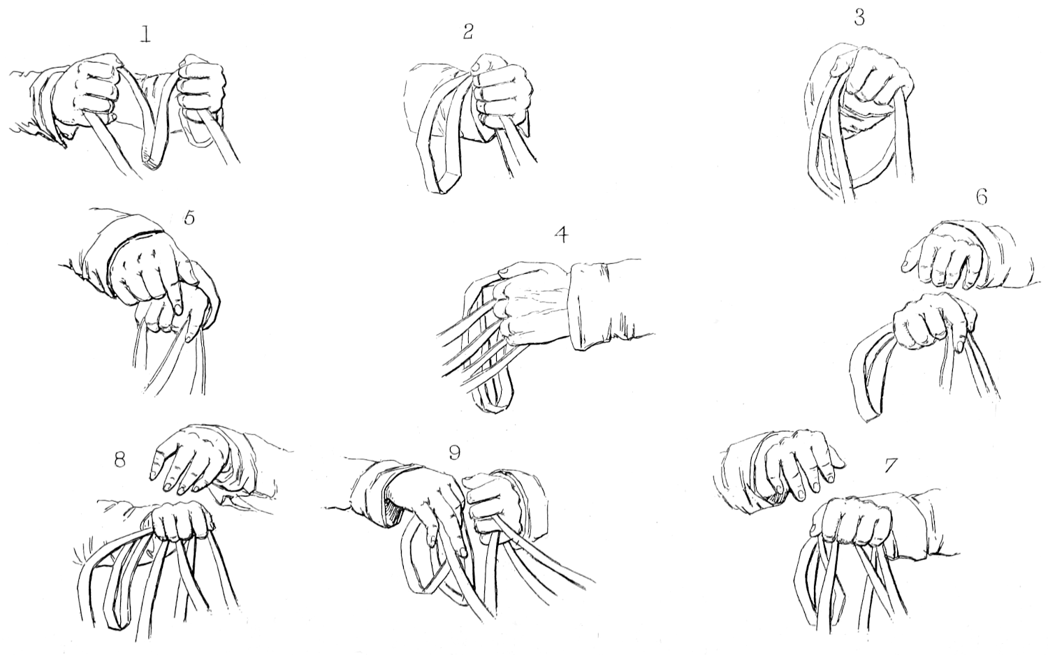Chains and springs on the bars are good things for night-work, as they prevent the leaders’ traces coming off. A narrow road, sufficiently wide, of course, for carriages to pass with convenience—with no ditch on the side—is much the best for night-work. Unless when the moon is very bright, a dark night is in favour of safe travelling. When it is what coachmen term “a clear dark,” the lamps give much better light than when the darkness approaches to grey. In very wide roads, particularly where there are no hedges to confine them, lamplight is both weak and deceiving; and moonlight is often glimmering and doubtful, particularly when clouds are passing rapidly. Lamplight is treacherous, both in fogs and when horses are going at a moderate pace, with the wind just behind them; for then the steam arising from their bodies follows them, and necessarily obstructs the light. Sometimes, from driven rain or snow, a coachman can scarcely open his eyes so as to see the road to the extent of the light given by the lamps, in which case a tight hand on the horses is especially necessary.