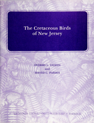 Olson, Storrs L., and David C. Parris. The Cretaceous Birds of New Jersey. Smithsonian Contributions to Paleobiology, number 63, 22 pages, 11 figures, 1987.—This is a revision of the fossil birds from Late Cretaceous (Maastrichtian; Hornerstown and Navesink formations) deposits in New Jersey. Material of previously named taxa, described over a century ago, is augmented by more recently collected specimens from a new locality at the Inversand Company marl pits near Sewell, Gloucester County. With about 8 genera and 9 species, this is the most diverse Cretaceous avifauna yet known. Most species belong to a group of primitive Charadriiformes resembling in limb morphology the fossil family Presbyornithidae and the living family Burhinidae. These are tentatively referred to the "form family" Graculavidae Fürbringer, 1888, with its provisional synonyms Palaeotringinae Wetmore, 1940; Telmatornithidae Cracraft, 1972, and Laornithidae Cracraft, 1972. The species included are: Graculavus velox Marsh, 1872; Telmatornis priscus Marsh, 1870 (synonyms: Telmatornis affinis Marsh, 1870; Graculavus pumilis Marsh, 1872; Palaeotringa vetus Marsh, 1870); Anatalavis rex (Shufeldt, 1915); Laornis edvardsianus Marsh, 1870; Palaeotringa littoralis Marsh, 1870; P. vagans Marsh, 1872; and an undescribed genus and species probably different from any of the preceding. Anatalavis is proposed as a new genus for Telmatornis rex Shufeldt, 1915. A new family, genus, and species (Tytthostonychidae, Tytthostonyx glauconiticus) is proposed for a humerus showing similarities to the Pelecaniformes and Procellariiformes and tentatively referred to the latter, along with an ulna of a much smaller species. The species in this fauna appear to be part of the modern radiation of neognathous birds, but none can be referred to modern families.