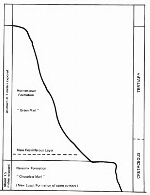 The third locality, and that yielding most of the recently obtained specimens, is the Inversand Company marl pit, located near Sewell, Gloucester County. In accordance with the wishes of the Inversand Company, the precise locality of this pit will not be disclosed, although this information is preserved in records sufficient in number and distribution to assure that it will not be lost. The Inversand specimens came from the main fossiliferous layer within the basal portion of the Hornerstown Formation (Figure 3). This layer is of late Maastrichtian age (latest Cretaceous), on the basis of invertebrate fossils, including three genera of ammonites, and a substantial vertebrate fauna, including mosasaurs (see Appendix). It is probable that the upper part of the Hornerstown Formation within the pit is of Paleocene age, as it is known to be elsewhere, but most paleontologists believe the basal portion to be Cretaceous in age (Gaffney, 1975; Koch and Olsson, 1977). One avian specimen is from an unknown level in the pit.