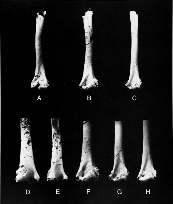 Comparisons.—This specimen comes from a very small bird. The only modern pelagic birds in this size range are the storm-petrels of the family Oceanitidae and the fossil resembles this family in the extremely straight shaft of the ulna, the shape and depth of the tendinal grooves, and the relatively well-developed scars for the attachment of the secondaries. It differs from the Oceanitidae in having the ventral lip of the external condyle much more rounded and protrudent past the plane of the shaft, whereas the carpal tubercle in dorsal view is markedly smaller. On this basis, the fossil certainly could not be referred to the Oceanitidae and that it should be associated with the Procellariiformes may be doubted as well.