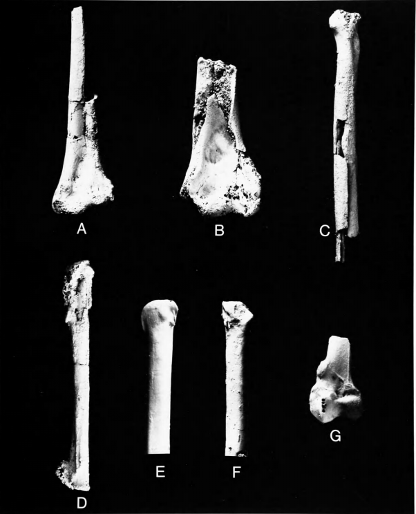 Comparisons.—The distal end of the humerus is the only reasonably diagnostic element in this assortment and indicates a large, robust species that would have exceeded in size any of the others known in this Cretaceous avifauna except Laornis edvardsianus, which was much larger still. In size this bird would have approximated the modern flamingo Phoeniconaias minor, which it somewhat resembles in morphology as well. The humerus is not greatly different from that of other Graculavidae in general aspect but is distinct in having a larger, much deeper, and more proximally situated brachial depression. It represents a species distinct from any of the others yet known in the fauna and is certainly generically distinct from all except possibly Graculavus, for which comparable elements are unknown.