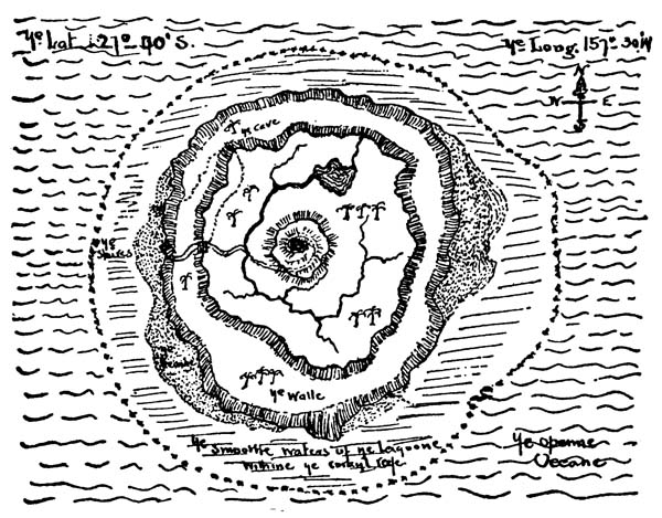 In order to safeguard the reputation of that worthy seaman and most gallant gentleman who writes this memoir, the editor thereof deems it proper to call attention to the fact that Master Hampdon has described accurately the Island of Mangaia of the Cook, or Hervey, group in the South Seas. It is still completely encircled by the unbroken barrier reef, over which the natives ride in their light canoes. The stairs still exist despite the earthquake to which Master Hampdon refers—and other upheavals which may have followed—and are still traversed by the feet of curious, if infrequent, visitors. For the rest, such altars and platforms as he and his little lady found still abound in the South Seas. Also on Easter Island, and on others, too, such statues of the grotesque and hideous “Stone Goddes” as he describes may be seen. Who made them and why, as well as when they were put there, are as much mysteries today as they were when, in that far-off time, Master Hampdon and his lady sailed those then unknown seas in that brave little barque The Rose of Devon.