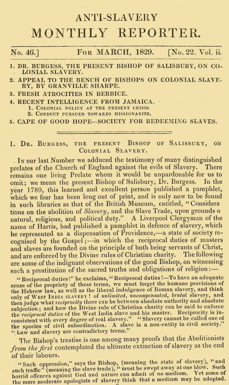1. DR. BURGESS, THE PRESENT BISHOP OF SALISBURY, ON COLONIAL SLAVERY.