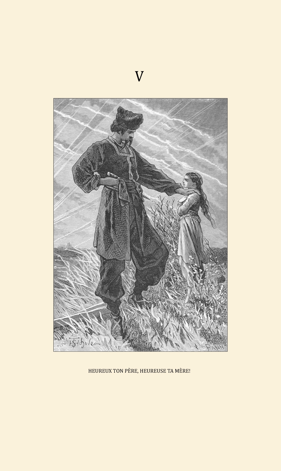 Maroussia repartit; de fatigue il n’était plus question, son ami l’avait désiré; elle avait des ailes. Le champ de sarrasin est dépassé, voici le petit pont, elle y dépose ses deux couronnes. Un bruit sourd avait frappé son oreille. Elle écoute, le bruit se rapproche et se fait sonore. Ce doit être celui d’un cheval lancé au galop. Le cavalier est-il un ami ou un ennemi? Ce n’est pas un Cosaque. De loin on dirait un Tatare. Quand elle voyageait avec le vieux rapsode, ils évitaient toujours ces Tatares. Elle revient sur ses pas, repasse le pont. C’est égal, les couronnes y sont, c’est autant de fait. Maroussia est contente. Elle va se cacher dans les joncs. Le cavalier arrive à bride abattue; l’aurait-il aperçue? Elle espère que non. Mais à peine Maroussia avait-elle fait quelques pas à travers ces joncs qui poussaient au bord du ruisseau, qu’un coup de feu était parti. Le mouchoir rouge, ainsi que la jolie tête qu’il recouvrait, était tombé au milieu des roseaux. On eût dit une perdrix arrêtée dans son vol.