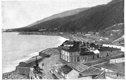 [241]It is a very remarkable railroad; its tracks cling to the perpendicular surface of the mountain like the tiny tendrils of a vine on a stone-wall, and the trains creep and crawl along the edge of its precipices, or twist themselves into the shape of a horseshoe magnet, so that the engineer on the locomotive can look directly across a bottomless chasm into the windows of the last car. The view from this train, while it pants and puffs on its way to the capital, is the most beautiful combination of sea and plain and mountain that I have ever seen. There are higher mountains and more beautiful, perhaps, but they run into a brown prairie or into a green plain; and there are as beautiful views of the ocean, only you have to see them from the level of the ocean itself, or from a chalk-cliff with the downs behind you and the white sand at your feet. But nowhere else in the world have I seen such magnificent and noble mountains running into so beautiful and green a plain, and beyond that the great blue stretches of the sea. When you look down from[242] the car-platform you see first, stretching three thousand feet below you, the great green ribs of the mountain and its valleys and waterways leading into a plain covered with thousands and thousands of royal palms, set so far apart that you can distinguish every broad leaf and the full length of the white trunk. Among these are the red-roofed and yellow villages, and beyond them again the white line of breakers disappearing and reappearing against the blue as though some one were wiping out a chalk-line and drawing it in again, and then the great ocean weltering in the heat and stretching as far as the eye can see, and touching a sky so like it in color that the two are joined in a curtain of blue on which the ships seem to lie flat, like painted pictures on a wall.