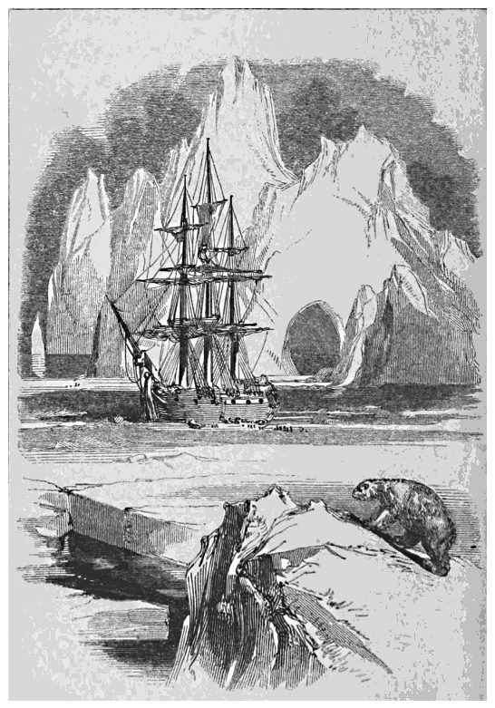 The prospect from the mountain which we ascended was most extensive and grand. A fine sheltered bay was seen on the east of us, an arm of the same on the north-east, and the sea, whose glassy surface was unruffled by the[Pg 53] breeze, formed an immense expanse on the west; the icebergs, rearing their proud crests almost to the tops of the mountains between which they were lodged, and defying the power of the solar beams, were scattered in various directions about the sea-coast, and in the adjoining bays. Beds of snow and ice, filling extensive hollows, and giving an enamelled coat to adjoining valleys, one of which, commencing at the foot of the mountain where we stood, extended in a continued line across the north, as far as the eye could reach; mountain rising above mountain, until by distance they dwindled into insignificance; the whole contrasted by a cloudless canopy of deepest azure, and enlightened by the rays of a blazing sun, and the effect aided by a feeling of danger, seated as we were on the pinnacle of a rock, almost surrounded by tremendous precipices; all united to constitute a picture singularly sublime.
