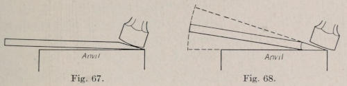 After the handle is shaped, and the holes are punched, including the one at the top to hang the fork by, the line to receive the copper is marked. (See Figure 63.) The marking should be done with a scratch awl. The line is then cut with a small chisel. This cutting should be quite deep and exact. This is important if the work is to be true and straight. All of the marking should be done while the handle is cold. It is now heated and taken to the anvil. A small punch, as represented in Figure 63, is then set onto the cut line and given a blow with the hammer, sinking the punch about ¹⁄₁₆ of an inch. One-half of the punch is now raised up and out of the channel. While it is directly on the chased line, it is given another blow with the hammer and so on until the end is reached. The particular thing to watch is to have the lead corner of punch directly on the chased guide line, while the other edge of the punch is in the channel in order to keep the finished line straight. Keep the punch in good order, straight and square at the end. The punch should not have much taper and should not be used after the red heat leaves the metal. After the entire line has been sunken ¹⁄₁₆ in. deep, the handle is reheated and the line is sunken perhaps ⅛ in. deep.