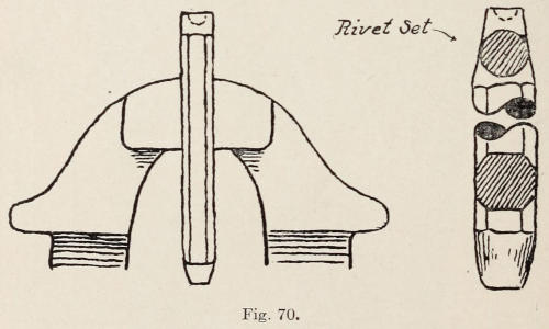 In fastening the angles to the sides, the heads of the rivets are on the outside, and the inside is smooth. In doing this, the heads of the rivets are held in a rivet set while hammering on the inside.