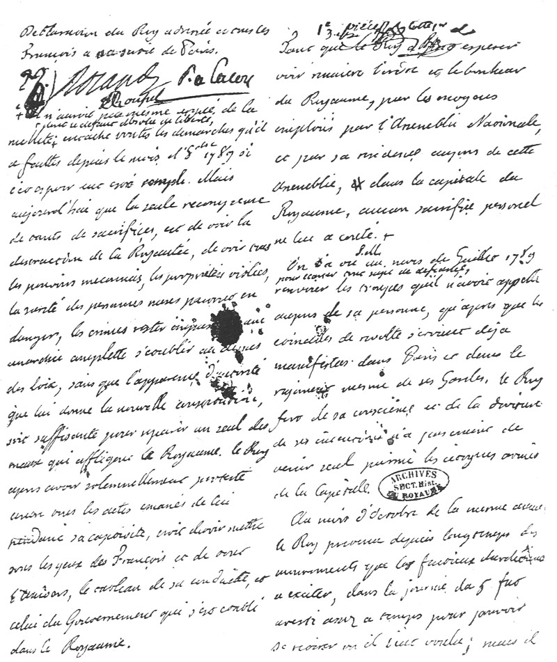 It is, as I shall presently show, authentic, and therefore of the highest possible interest to every student of history. The traveller will find it to-day in the central glass case of the square Revolutionary Room in the Carnavalet Museum. The body of the writing is not in the hand of Louis himself, but the signature is undoubtedly his. The lines were scribbled in haste by some one attendant upon the King, signed by him, and sent to the palace.