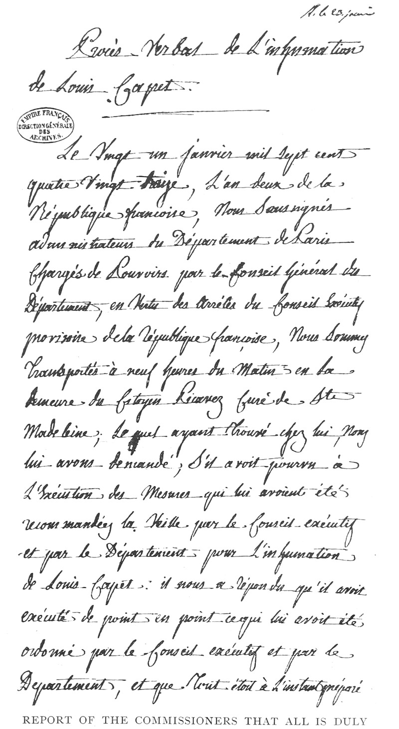 | Report of the Commissioners that all is duly arranged for the Burial of Louis Capet after his Execution | 346 |