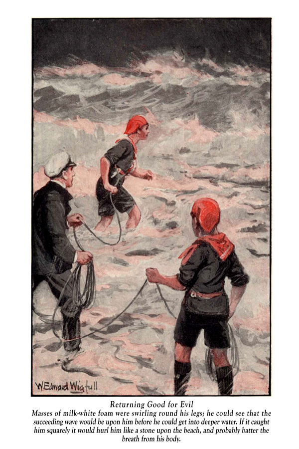 Now came the supreme effort—to regain the beach without being pounded by the breakers. It was easy enough to come ashore—the waves would see to that—but it was far from a simple task to protect himself and his senseless burden from the terrible onslaught of the hammering surf. And such a lot depended upon the life-line being hauled in at exactly the right moment.