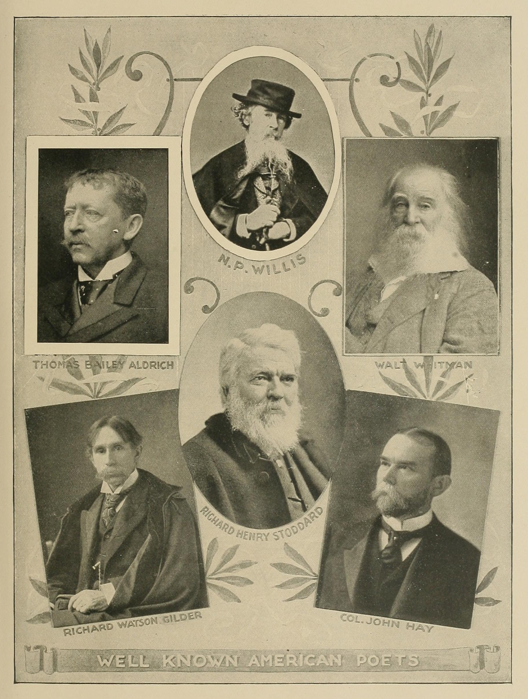 Part I., “Great Poets of America,” comprises twenty of our most famous and popular writers of verse. The work necessarily begins with that immortal “Seven Stars” of poesy in the galaxy of our literary heavens—Bryant, Poe, Longfellow, Emerson, Whittier, Holmes and Lowell. Succeeding these are those of lesser magnitude, many of whom are still living and some who have won fame in other fields of literature which divides honors with their poetry. Among these are Bayard Taylor, the noted traveler and poet; N. P. Willis, the most accomplished magazinist of his day; R. H. Stoddard, the critic; Walt Whitman; Maurice Thompson, the scientist; Thomas Bailey Aldrich and Richard Watson Gilder, editors, and Colonel John Hay, politician and statesman. The list closes with that notable group of well-known Western poets, James Whitcomb Riley, Bret Harte, Eugene Field, Will Carleton, and Joaquin Miller.