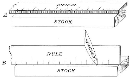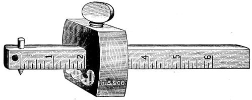 3. The Marking Gauge. The marking gauge is shown in Figs. 6 and 7. A is the gauge stick, B the gauge block, S the set screw, and P the marking point, or spur. The gauge stick is graduated like a rule into inches and fractions, beginning at the steel marking point; but as the latter is not always exactly in the right place the graduations are not entirely reliable. It is safer then to set the gauge with the rule in the manner shown in Fig. 7.