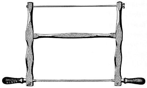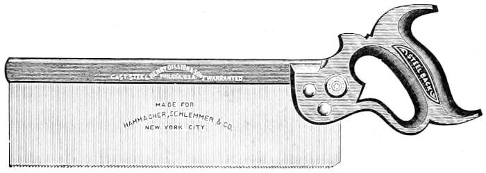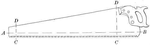We are inclined to think of the saw as a very commonplace article, yet a careful examination will prove that the greatest care and skill are needed in its manufacture. Observe that the body, which must be of the best steel, tapers, being considerably wider at the[14] handle than at the opposite end. This is to give strength, and to prevent buckling, or bending, as the tool is pushed forward.