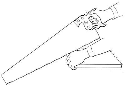 The saw should be held in the right hand, with the left grasping the board. The thumb of the left hand acts as guide, the saw is tilted, as shown in Fig. 15, and drawn toward the worker at the first stroke. This tool should[15] be used without exerting much pressure, in accordance with the general rule that we do our best work with tools when we work easily and deliberately.