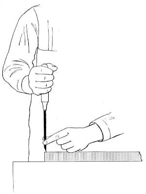 To gauge a line parallel to the edge of a block hold the tool firmly, with thumb and forefinger encircling gauge block. Tip the tool away from you until the marking point (spur) barely touches the wood and push the tool away from (never toward) you. The line made should be as fine as a knife line. A little practice is needed to give the proper control, as the marking point tends to follow the grain of the wood, which is usually not straight.
